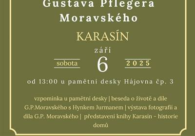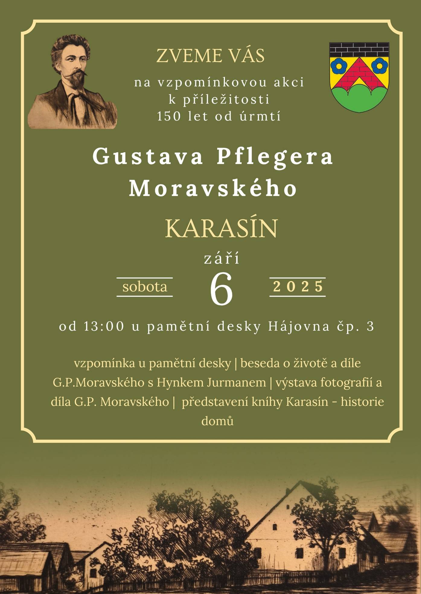 Zveme Vás na vzpomínkovou akci k příležitosti 150 let úmrtí Gustava Pflegera Moravského, která se uskuteční 6. září od 13.00 hod. v Karasíně u pamětní desky Hájovna čp. 3